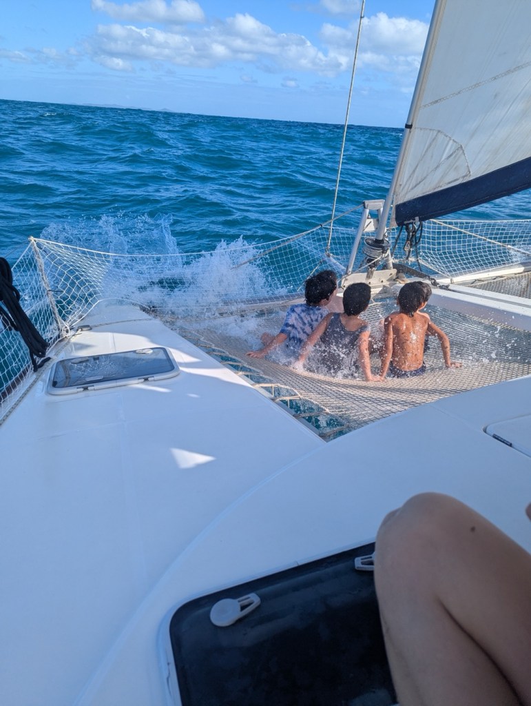 הים יחסית גבוה והילדים יושבים על הרשת בחרטום וכל גל שעובר שוטף אותם, הם צורחים מהתרגשות וכולנו צוחקים ומתמוגגים.