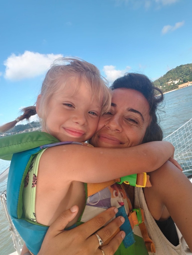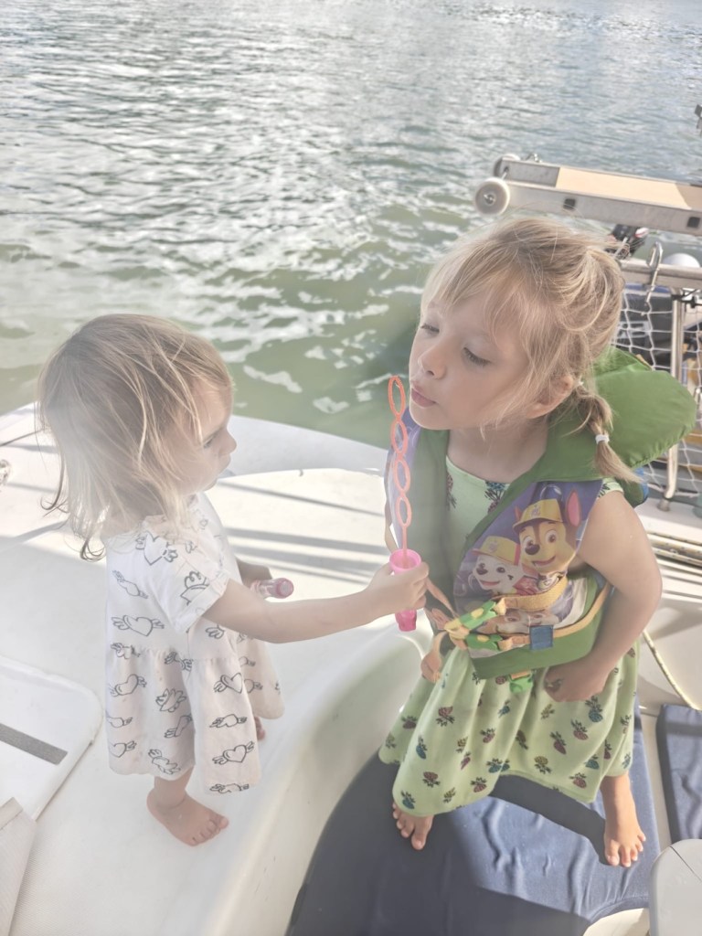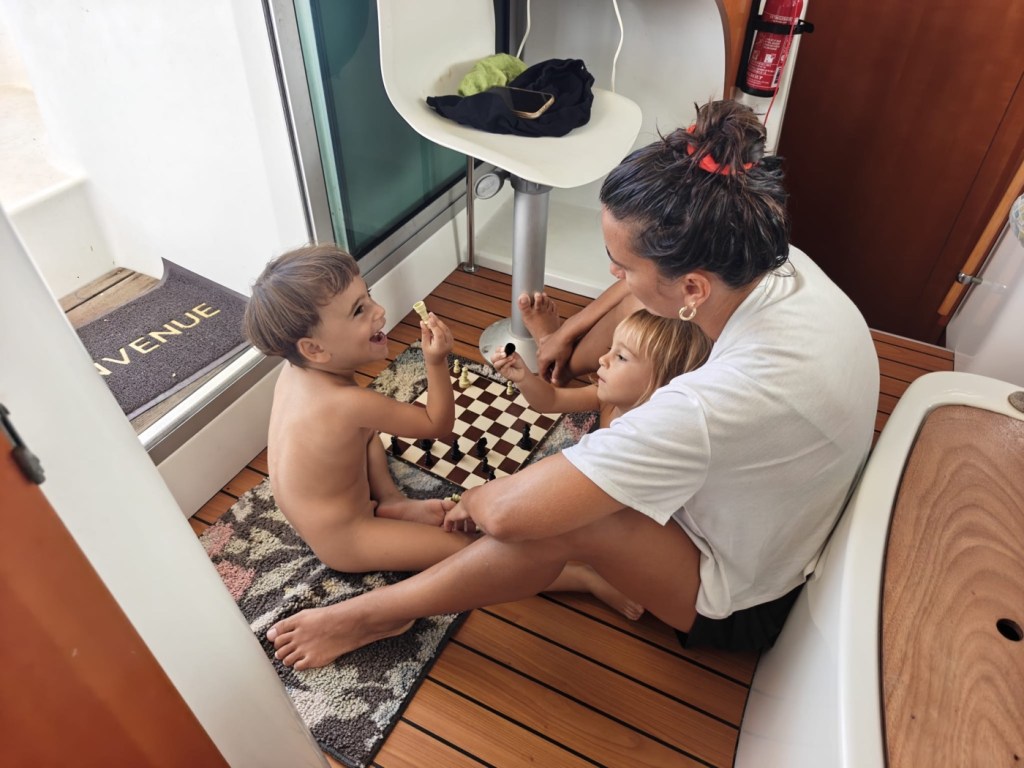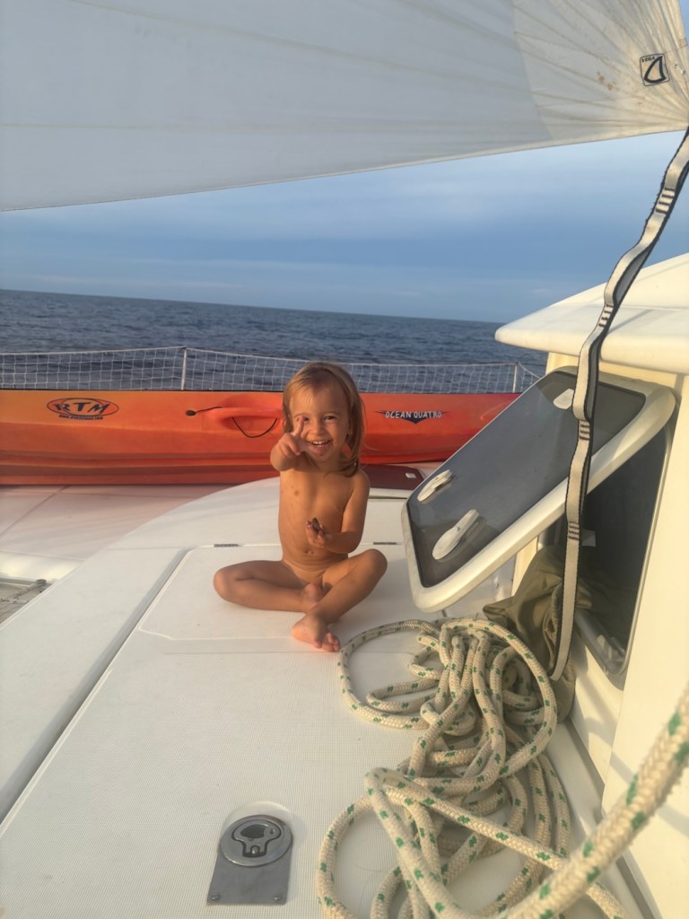 הילדים לימדו את ענבר לעשות "ספיידרמן" על הסירה שלנו. משחק שהמציאו שתולים את הערסל בתורן וקופצים לים כמו בנג׳י והולכים הצידה על דופן הסירה קרוב למים.