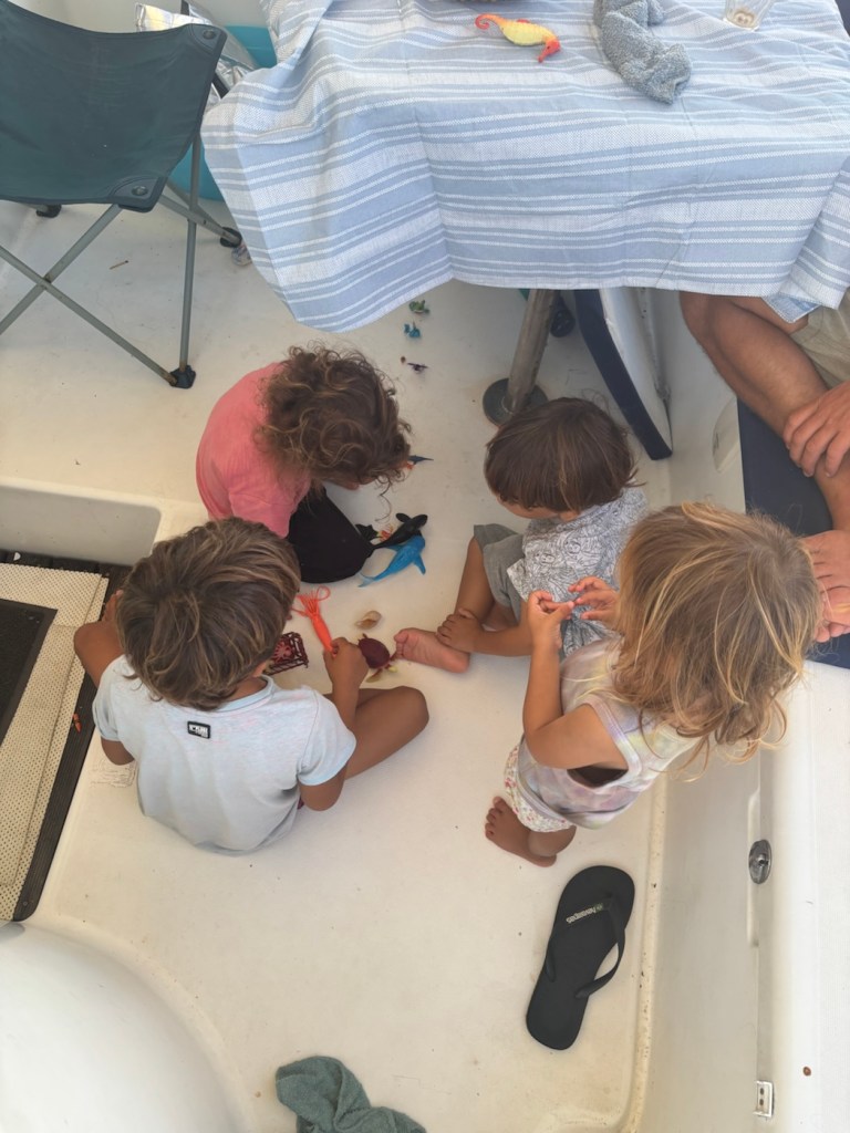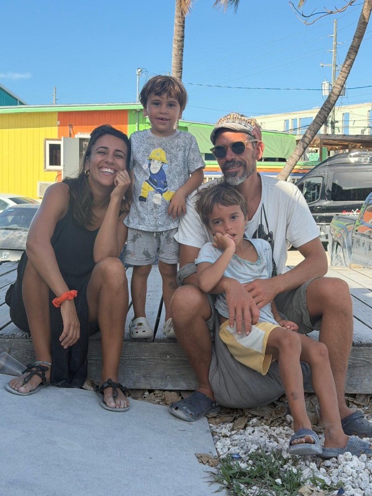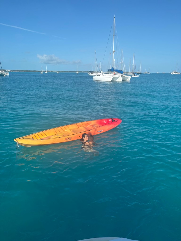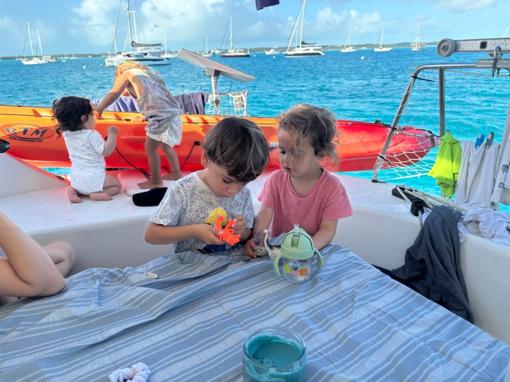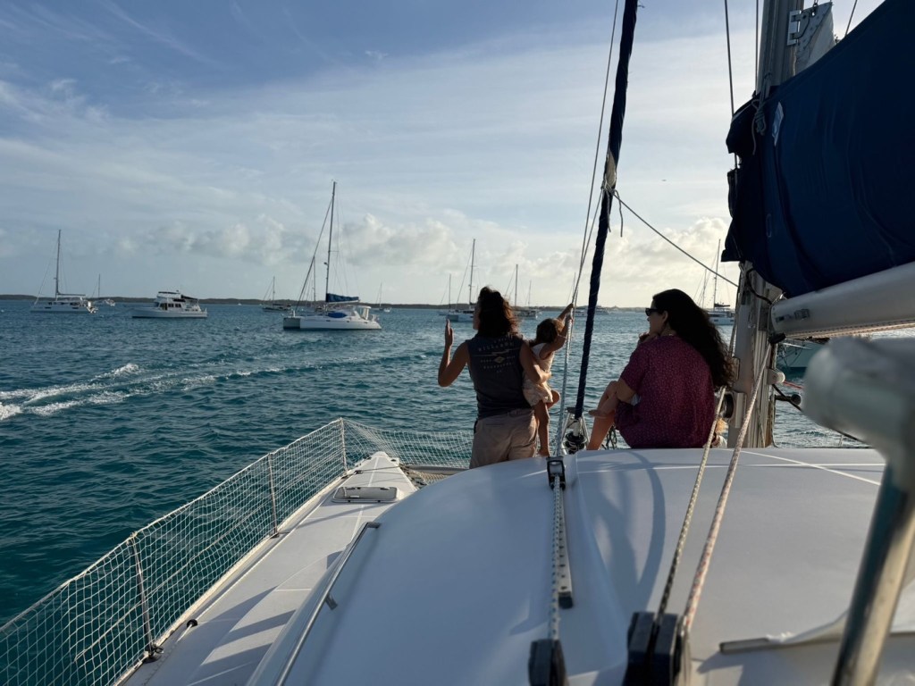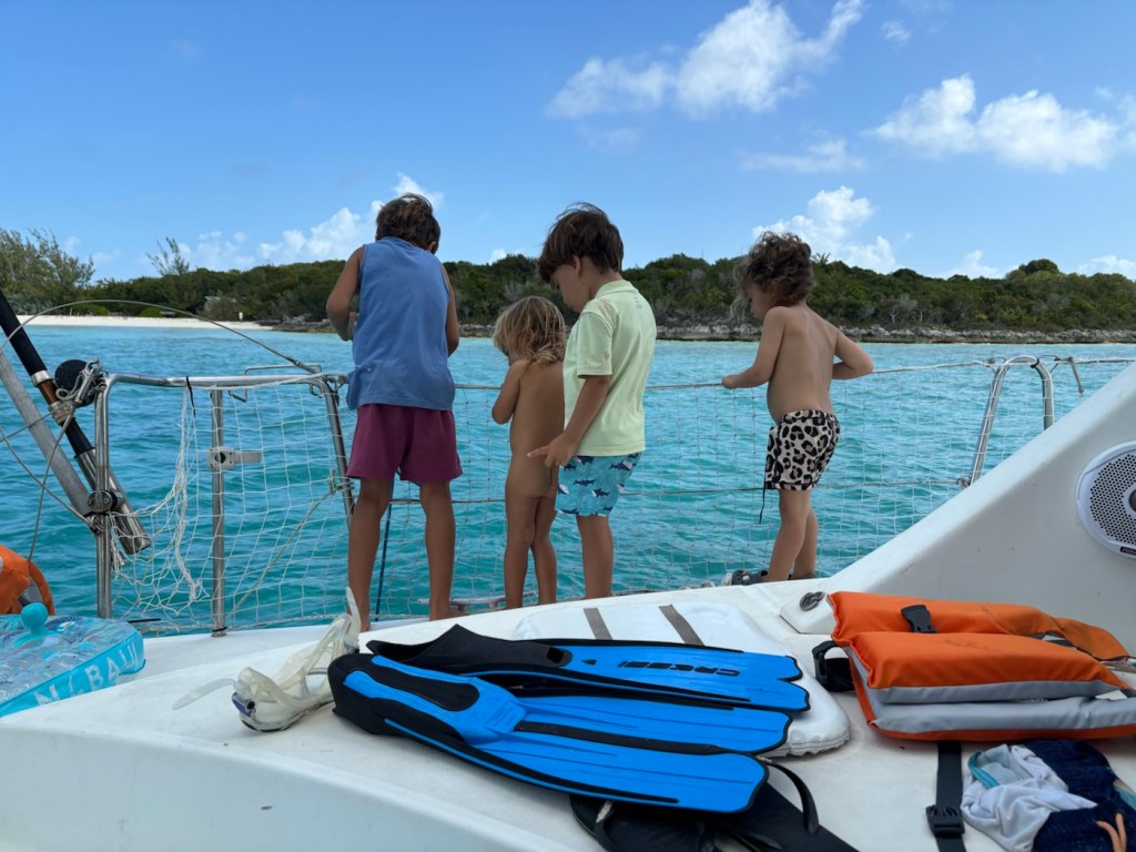 אלון, הילה ושני ילידהם המדהימים גור וצוף, עלו לדינגי שלנו מהרציף בג׳ורג׳ טאון בבאהמס
