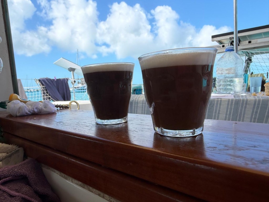 אלון הקציף חלב לקפה משובח שהביאו מהארץ . כל כך התגעגענו לחלב מוקצף שנימוח כמו עננים רכים בשפתיים
